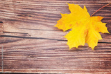 Yellow maple leaf on a dark wooden background. Thanksgiving Day. Autumn background.