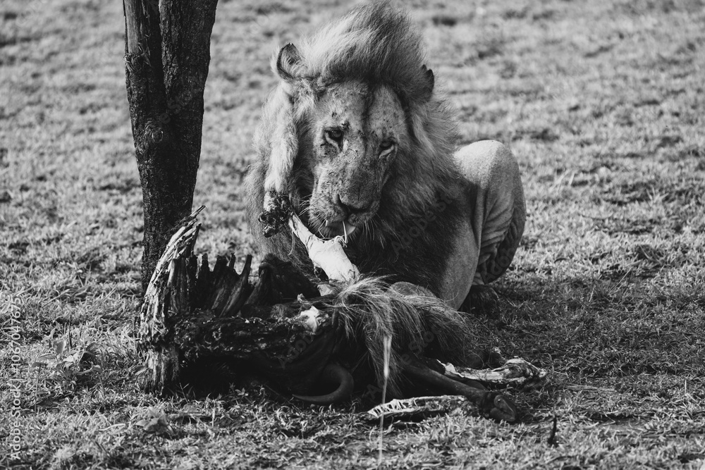 black and white grayscale portrait of a male lion, alpha lion, tearing into a wildebeest carcass and eating from it