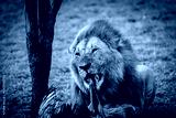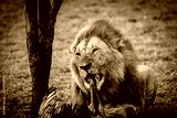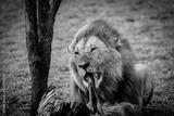black and white grayscale portrait of a male lion, alpha lion, tearing into a wildebeest carcass and eating from it