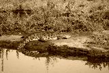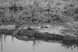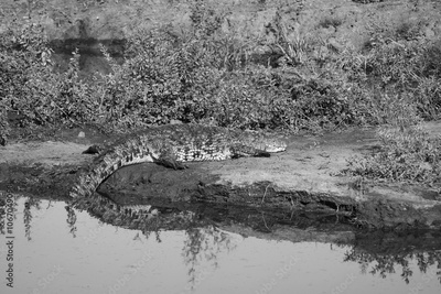 black and white greyscale portrait of a nile crocodile laying at the shore of a water hole at the serengeti national park tanzania