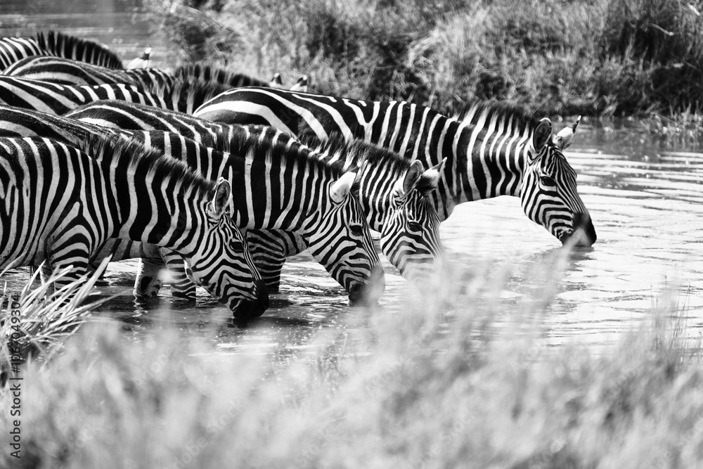 black and white greyscale portrait of zebras in the wild drinking water at a water hole in the serengeti national park tanzania