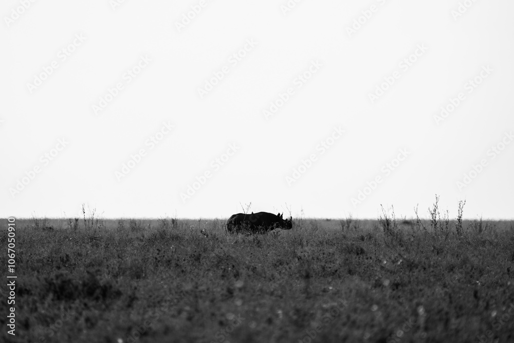 black and white greyscale portrait of a rhino grazing in the serengeti national park