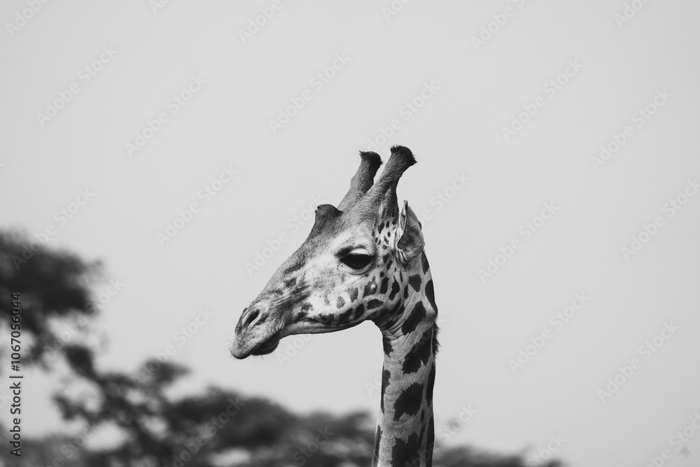 greyscale - grayscale - black and white portrait of thee head of a giraffe uganda lake mburo