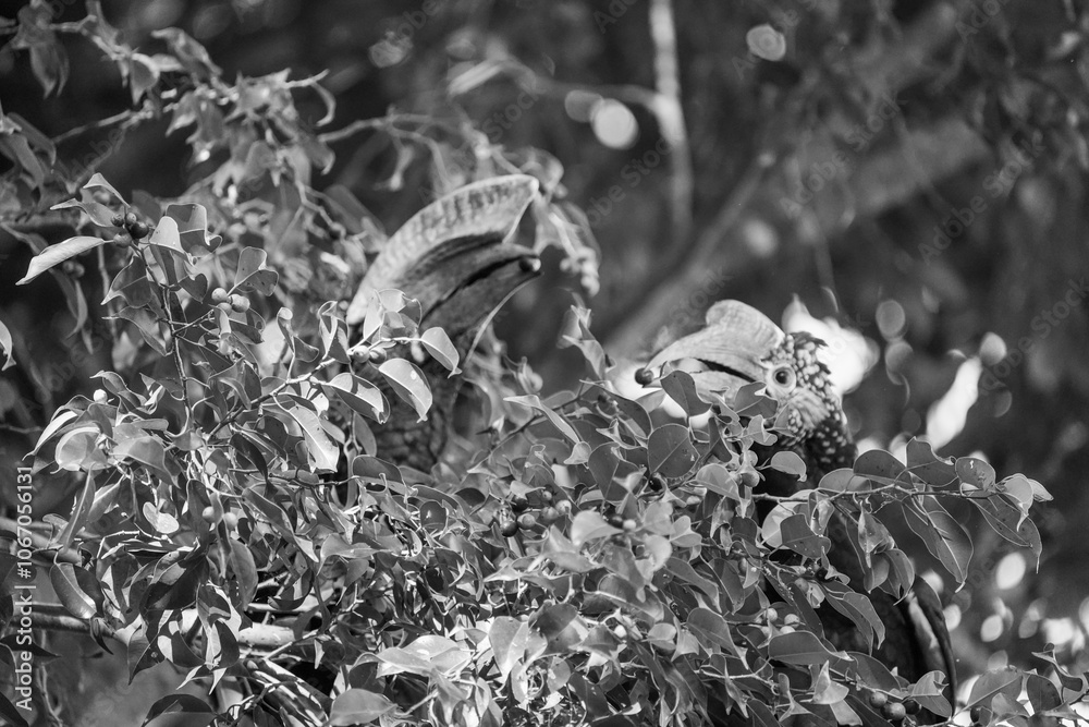 silvery cheeked horntails eating berries portrait greyscale - grayscale - black and white