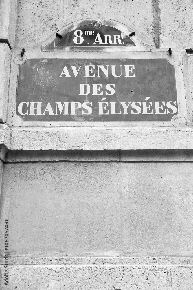 Paris - Champs Elysees avenue sign. Black and white retro style photo.