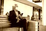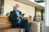Male business commuter with face mask using his phone.