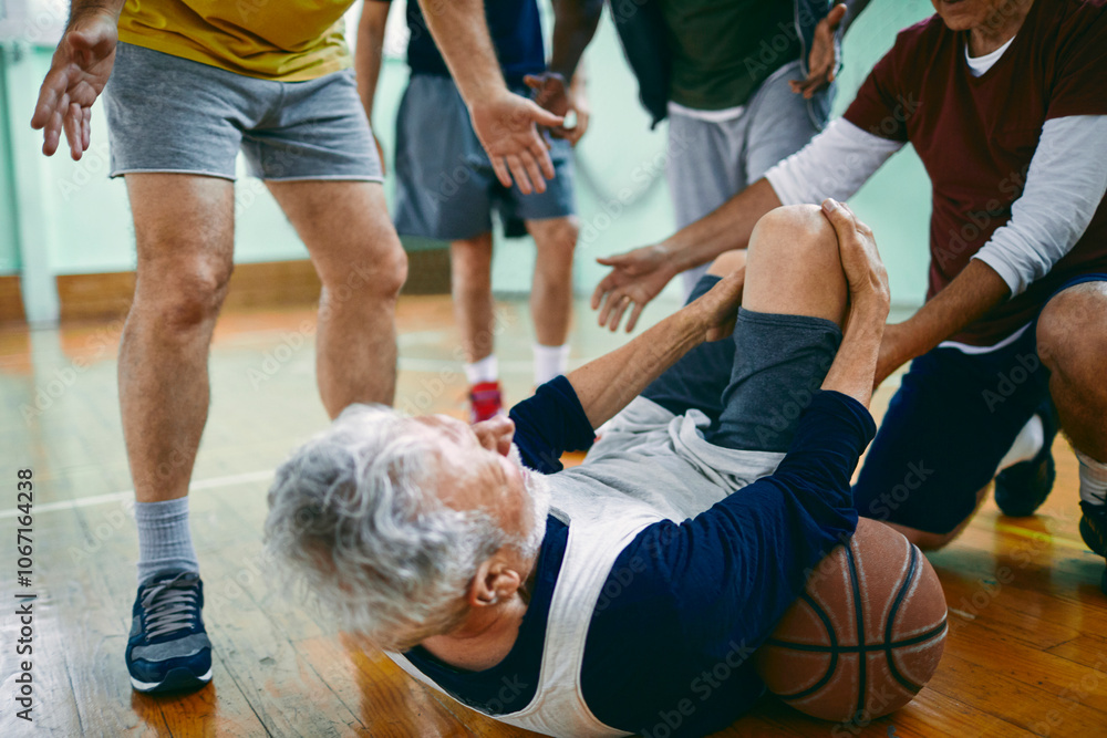 Senior man falling on the floor injured while playing basketball in an indoor gym