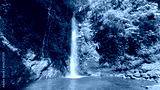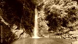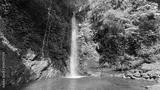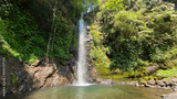 This photo depicts a waterfall in the middle of a waterfall forest, where there is a river whose water falls with beautiful rocks