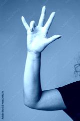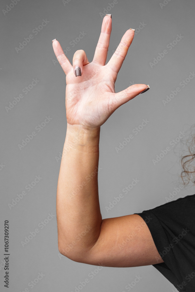 A person making the I love you gesture with their hand in front of a neutral gray background