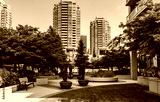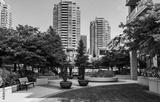 Garden oasis set amongst towering high-rise residential condominiums in Burnaby, BC, Canada.