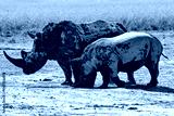 two rhino in africa botswana full with mud after a bath, grazing in the savannah