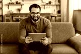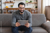 Middle-aged Arabian man sitting at home on the sofa holding a digital tablet in his hand. Confident male wearing glasses and casual clothes. He is having video call or browsing on the internet.
