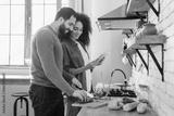 Joyful young mixed race couple african woman arabian man using online app on tablet cooking together in home kitchen ordering food delivery on supermarket store internet website consulting recipe