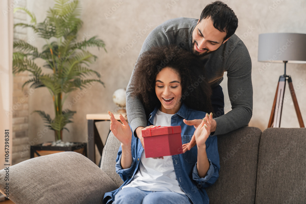 Happy Arabian husband congratulates wife on birthday, man makes surprise, gives to beloved woman gift box with present, family celebrating life events, hugging expressing love. Congrats concept