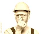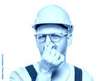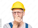 Dissatisfied construction worker holding his nose closed has disgusting expression on face, something stinky, isolated on white background. Craftsman against white wall