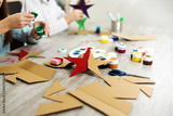 Handmade stars from cardboard. Eco-friendly handicraft and Christmas decorations and ornaments. Children design cardboard decorations.
