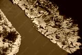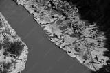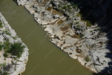 Vue aérienne des Gorges de l'Ardèche sur lesquelles sont pratiquées des activités aquatiques