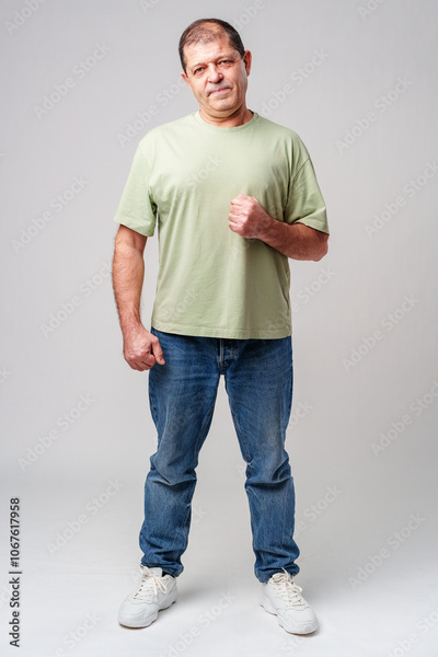 A middle-aged man stands confidently in casual attire against a neutral background