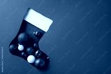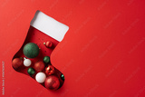 A creative top view arrangement of colorful Christmas balls inside a sock-shaped cutout on a vibrant red background, capturing the festive holiday spirit