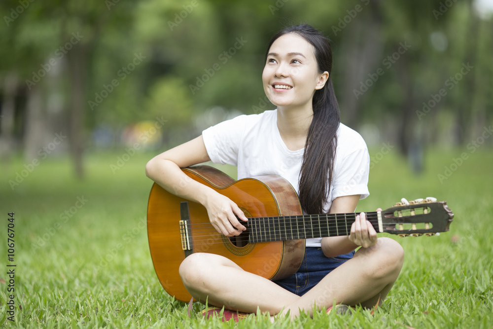 Young attractive woman playing acoustic guitar