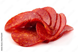 Spanish pork chorizo sausage slices, close-up, isolated on white background.