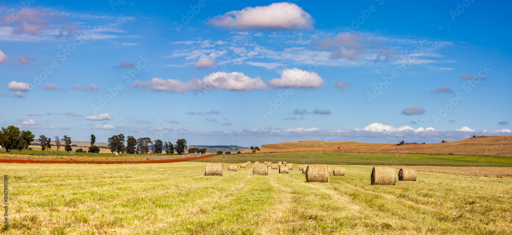 bale rolls of stack straw haystack on the field, harvest on a meadow, hill in the backgrounds