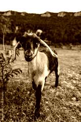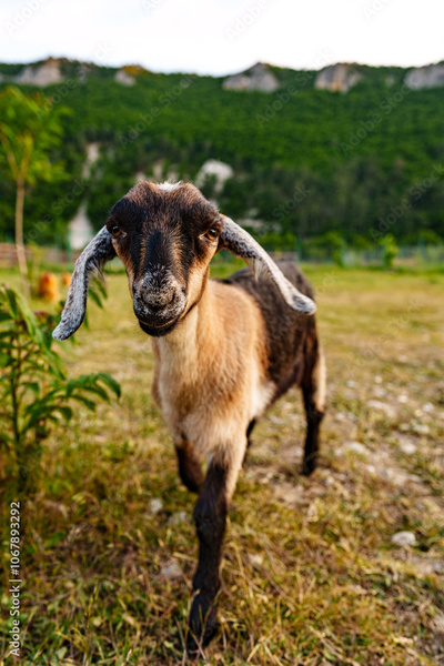 A friendly goat exploring a grassy field under a clear sky in a serene countryside