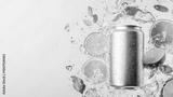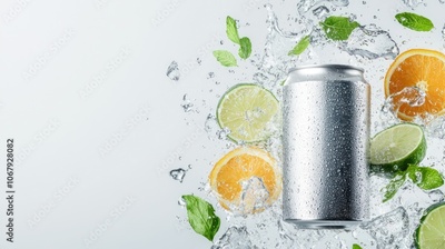 Refreshing energy drink can surrounded by citrus and mint
