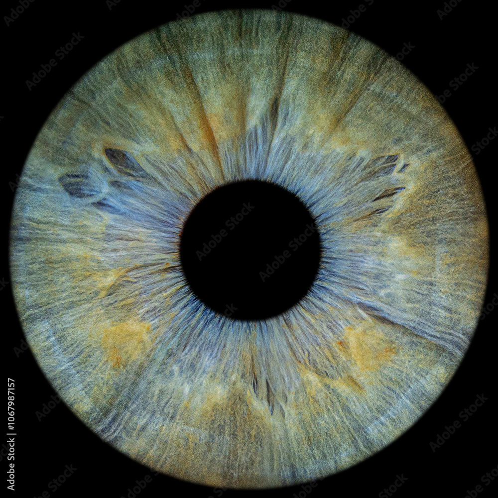 High-resolution macro photograph of a human eye iris, capturing intricate details and vibrant eye colors.