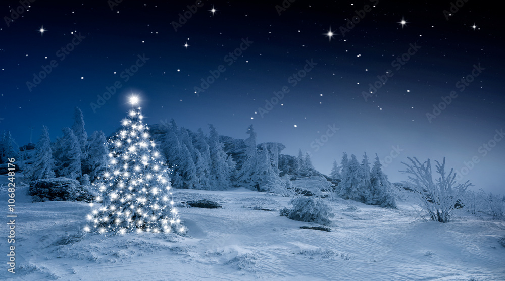 Leuchtender Weihnachtsbaum im Schnee bei Nacht