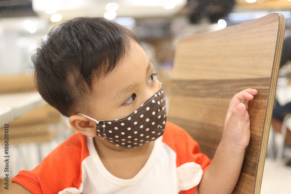 An Asian boy about two years old wears a mask when he goes to a shopping mall.