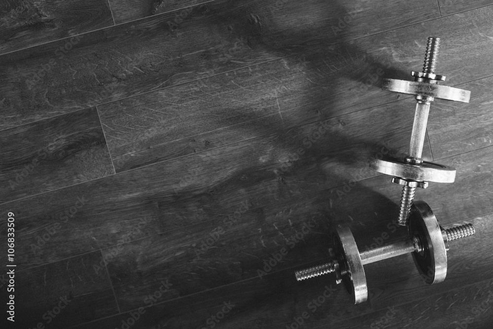 Top view of a dumbells on a wooden background in a gym, healthz