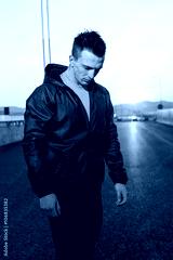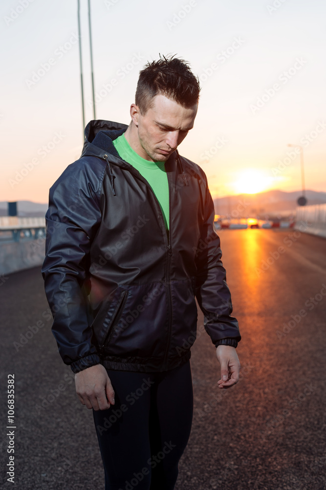 athletic man relaxing after hard work out, highway sunset