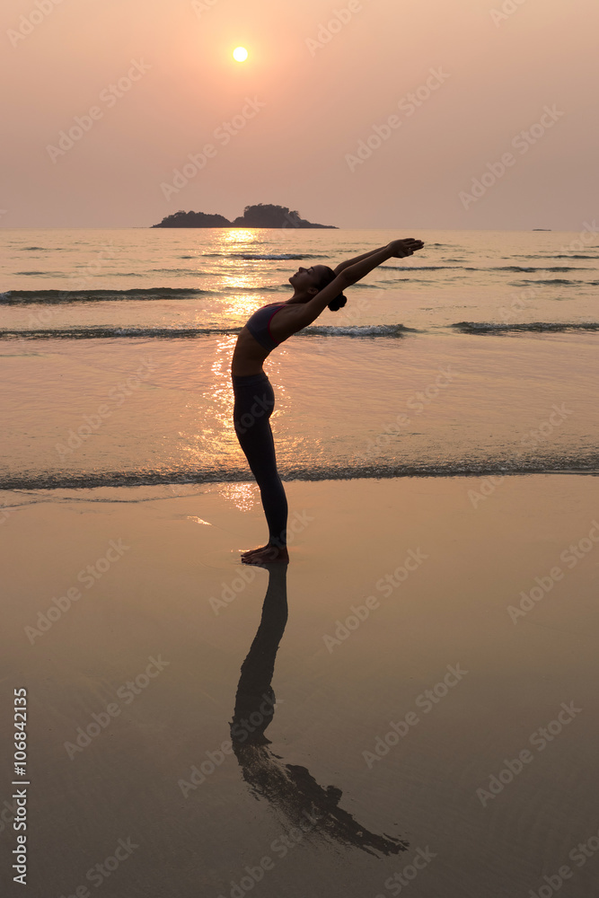 Young slim woman practicing pose from yoga on the beach at sunse