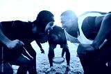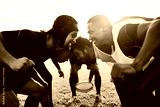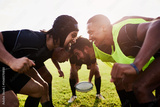 Men, team and rugby ball for scrum, outdoor and challenge in exercise, wellness and fitness. Male people, athlete and recreation facility as group for match, sports and training in stadium or arena