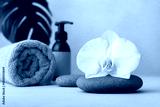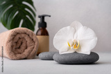 White orchid flower on smooth grey stone with green leaf background