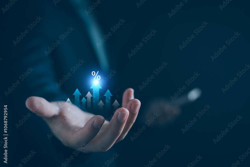 Interest rate and dividend concept, Business man with business growth percentage symbol and up arrow, fund investment, save money, Interest rates continue to increase, return on stock, business banner