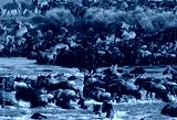 Wildebeests are crossing Mara river. Great Migration. Kenya. Tanzania. Masai Mara National Park. An excellent illustration.