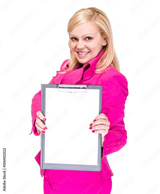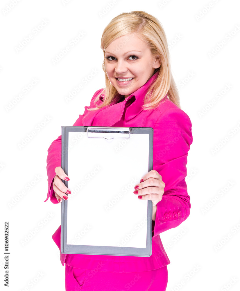 Happy smiling young business woman showing blank signboard