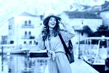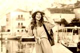 Holidays in Europe. Walks along the embankment. Beautiful female tourist enjoys the view of the city.