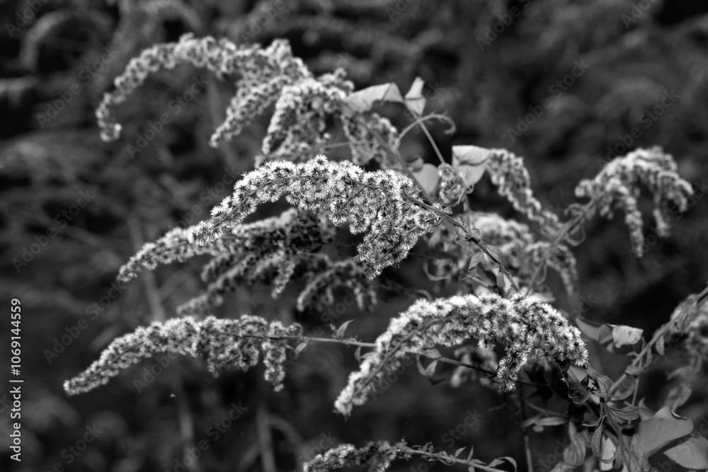 Goldenrod, grassfish - bloomed, autumn season, black and white graphic photo. Background.