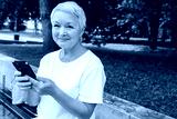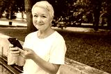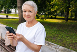 Over shoulder shot of happy European gray-haired older female holding smartphone, surfing, using mobile apps for online shopping, e-learning on cell phone sitting outdoor in park, looking at camera.