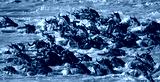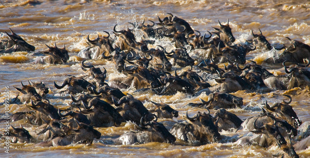 Wildebeests are crossing Mara river. Great Migration. Kenya. Tanzania. Masai Mara National Park. An excellent illustration.