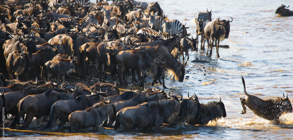 Wildebeests are crossing Mara river. Great Migration. Kenya. Tanzania. Masai Mara National Park. An excellent illustration.
