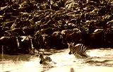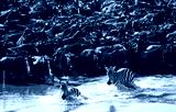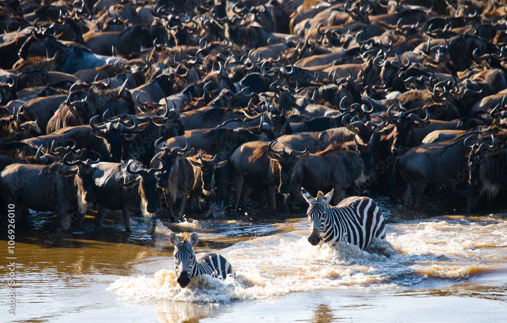 Wildebeests are crossing Mara river. Great Migration. Kenya. Tanzania. Masai Mara National Park. An excellent illustration.