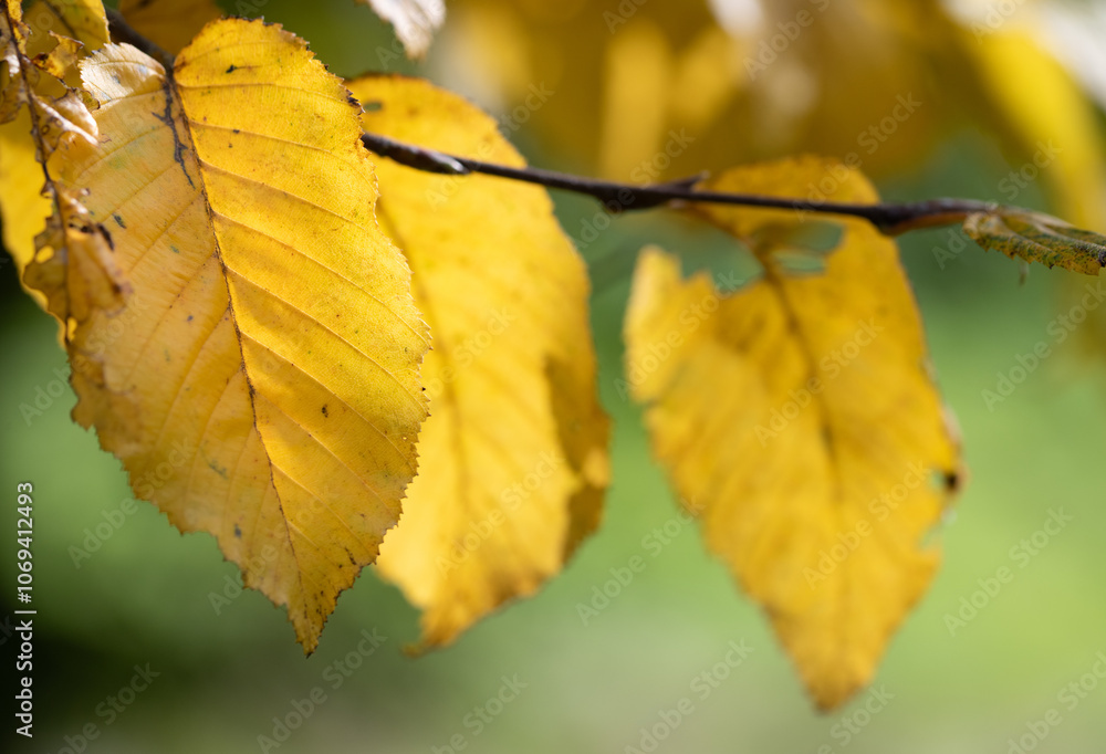 Close-up of golden-yellow leaves hanging from a tree in the fall. The sun shines through the leaves