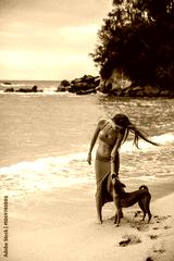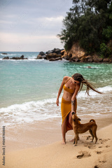 A Young Woman Happily Enjoying a Relaxing Beach Walk with Her Dog by the Ocean Waves