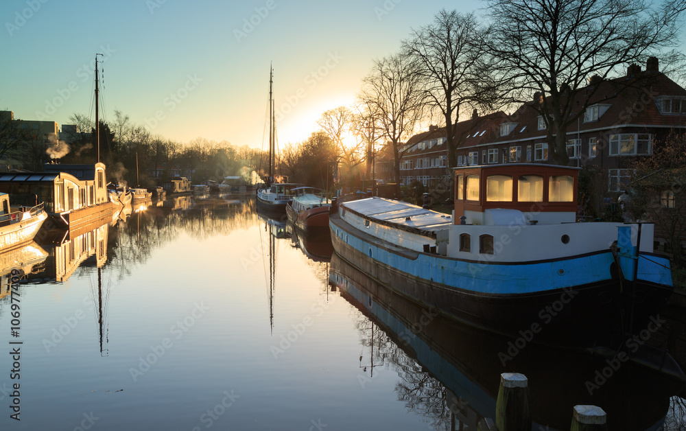 Tranquil sunrise at a Dutch canal in thew city of Groningen, Holland.