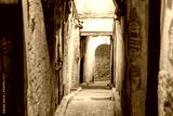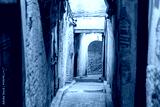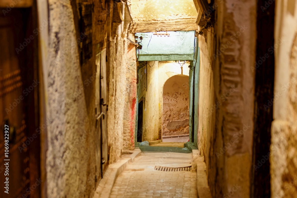 Street scene in the medina of Fes, Fès, Fez, Moroco, at night. Narrow street, chiaroscuro atmosphere. No people.