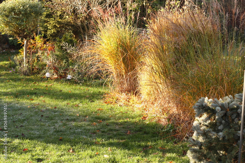 rośliny, kwiaty, trawy ozdobne, ogród, jesień, kolory, pory roku, klon palmowy, słońce, pogoda, ciepło, liście, skalniak, kompozycja, klomb